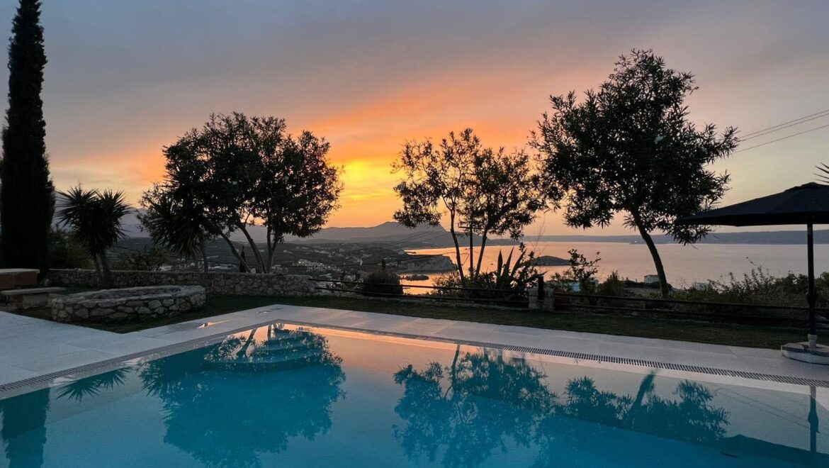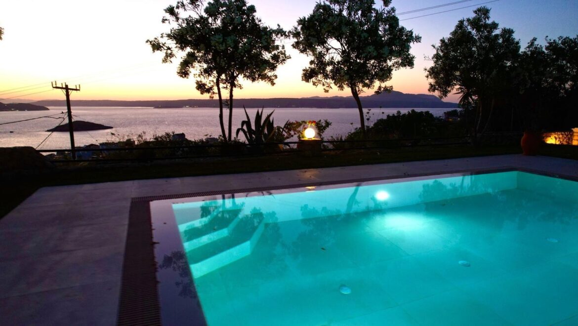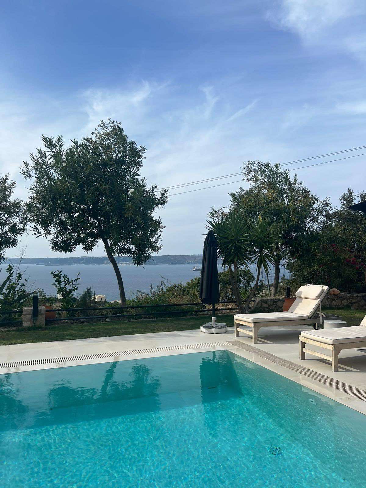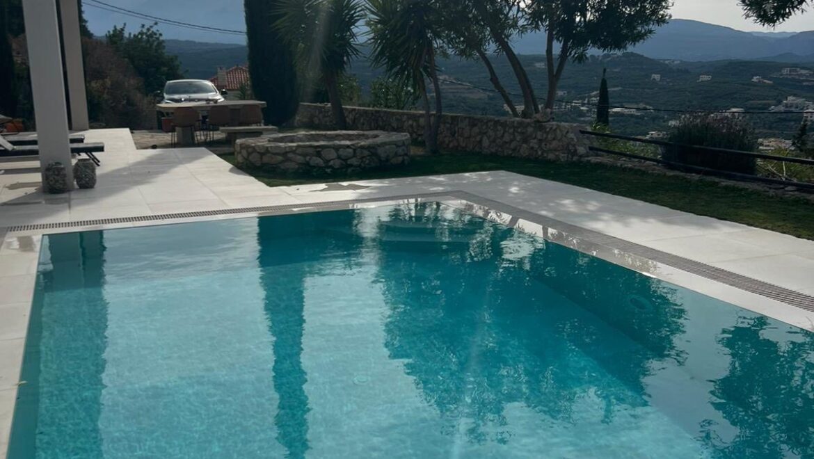 Outside, the private swimming pool of 34,68 square meters mirrors the deep blue horizon, surrounded by sun-drenched lounging areas and lush Mediterranean greenery — a setting designed for moments of pure calm and joy.