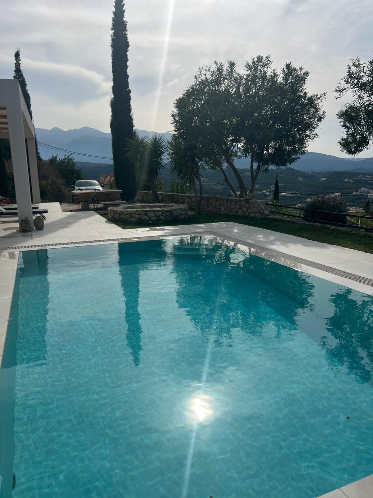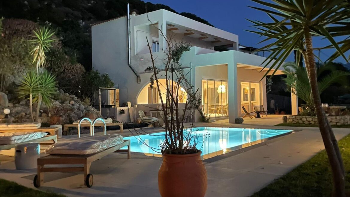 The villa’s contemporary architecture blends elegance with warmth — spacious, sun-filled rooms open to terraces that frame breathtaking sea and mountain views.