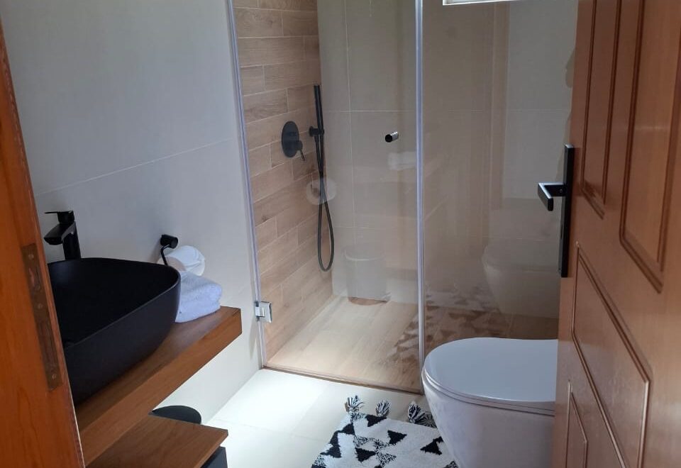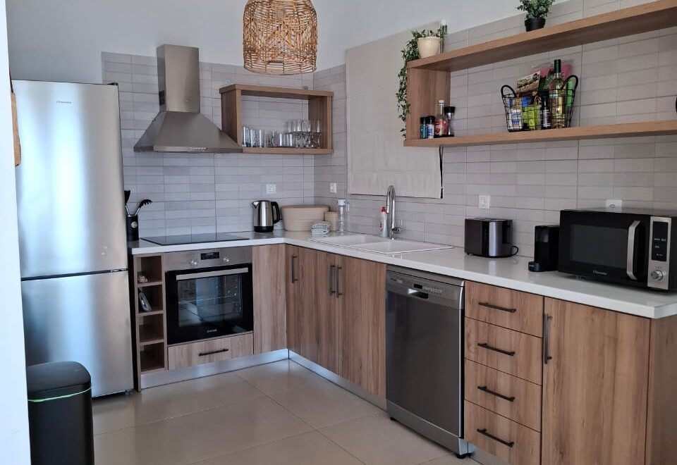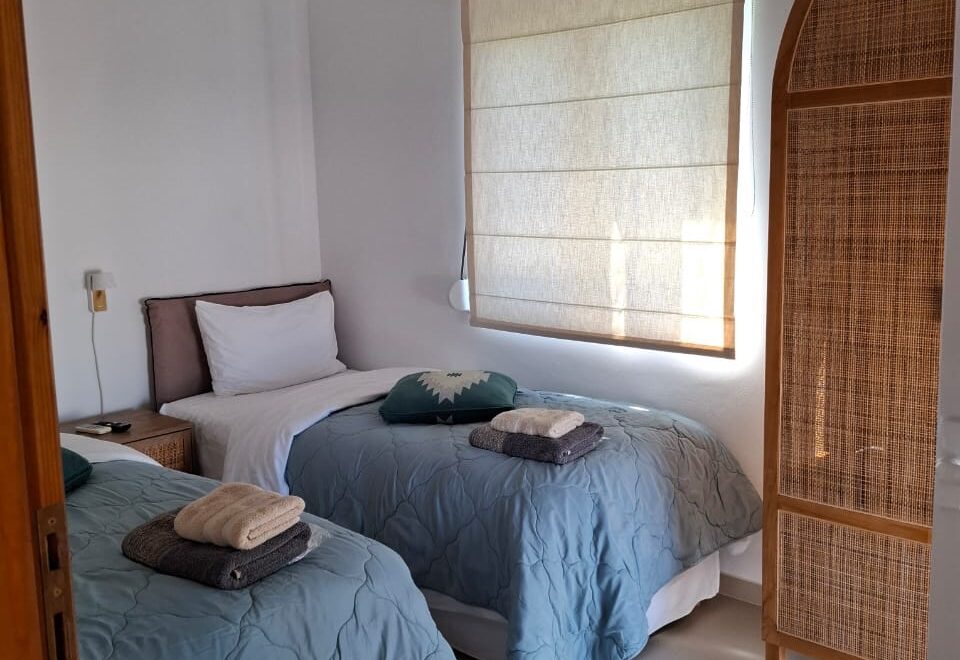Upstairs, two tranquil bedrooms open onto private balconies, where mornings begin with the sound of waves and evenings end in the glow of sunset. The upper-level bathroom features a luxurious hot tub, the perfect place to unwind as the sky turns golden over the sea.